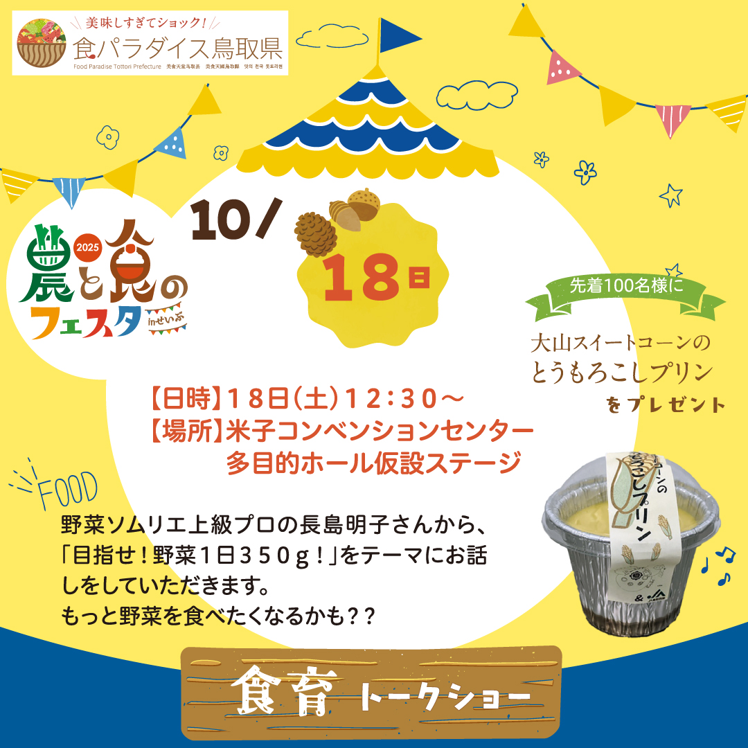 10月18日(土)12:30~、米子コンベンションセンター多目的ホール仮設ステージにて「食育トークショー✨」を開催します。