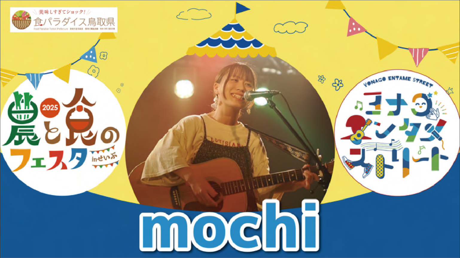 mochiはこれまで「ヨナゴエンタメストリート」などで観客と近い距離でのライブパフォーマンスを展開してきたアーティストです。自然体の歌声と温かい表現で、地域の風景や日常を音楽に紡ぐスタイルが魅力です。